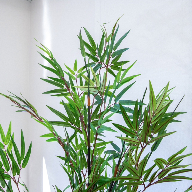 清涼感のある緑の葉と、漆黒の幹(茎)とのコントラストが美しい黒竹は、通常の竹よりも「高級感」や「大人な雰囲気」を感じさせる植物です。落ち着いた「和モダン」な空間や、料亭、旅館のような「格式高い」インテリアを演出したい場合に最適です。