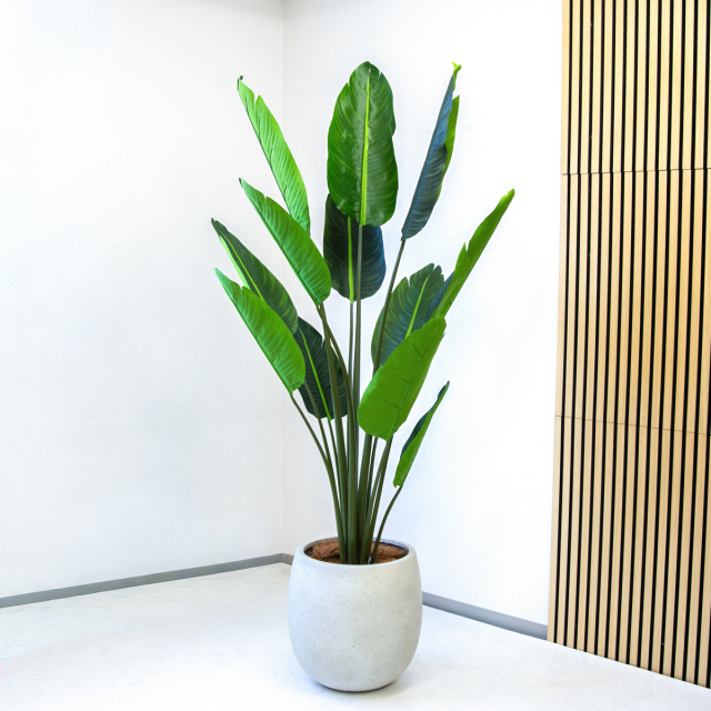 バナナの葉のような、大きくて丸い葉が特徴のオーガスタ(ストレチア・ニコライ)は、そのダイナミックな姿から「トロピカル」で開放的な雰囲気を演出する人気の植物です。置くだけで、まるで「リゾートホテル」のロビーのような、ラグジュアリーでゆったりとした空間を作ります。