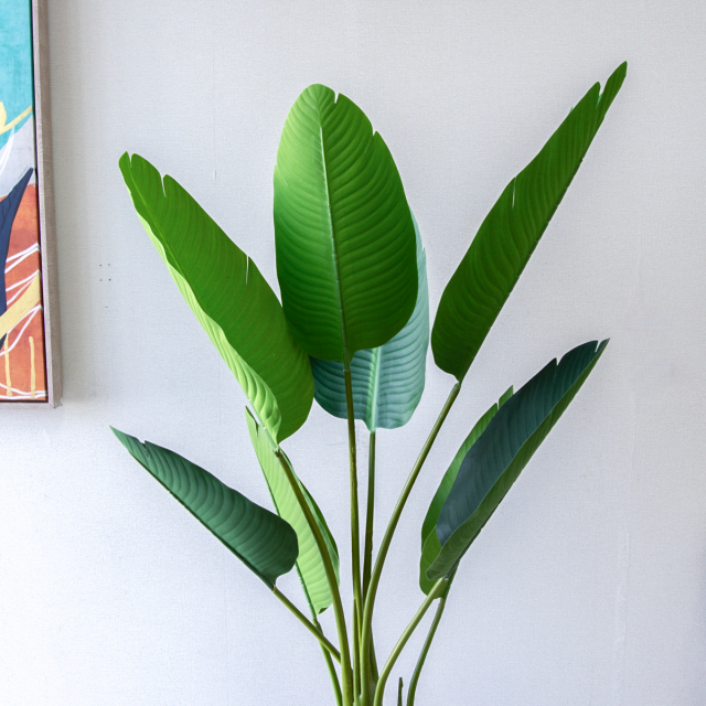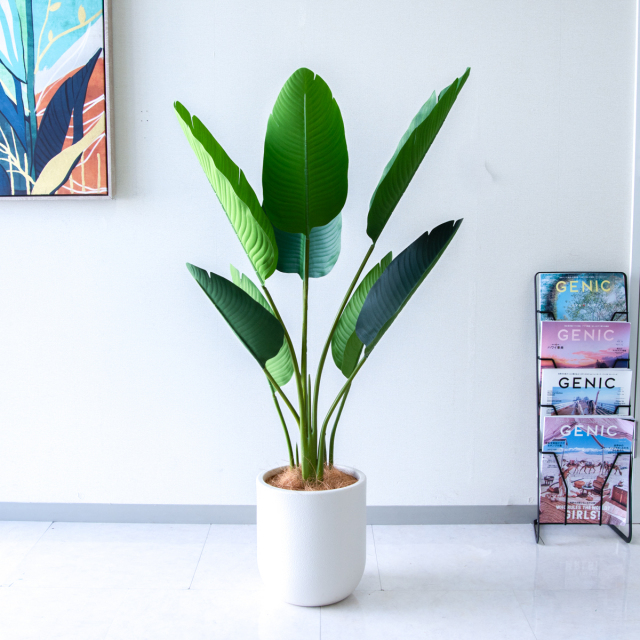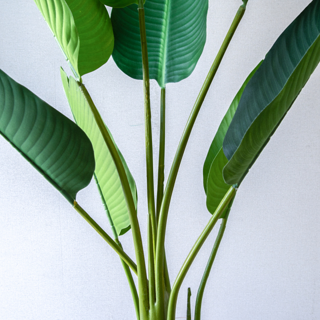 バナナの葉のような、大きくて丸い葉が特徴のオーガスタ(ストレチア・ニコライ)は、そのダイナミックな姿から「トロピカル」で開放的な雰囲気を演出する人気の植物です。置くだけで、まるで「リゾートホテル」のロビーのような、ラグジュアリーでゆったりとした空間を作ります。
