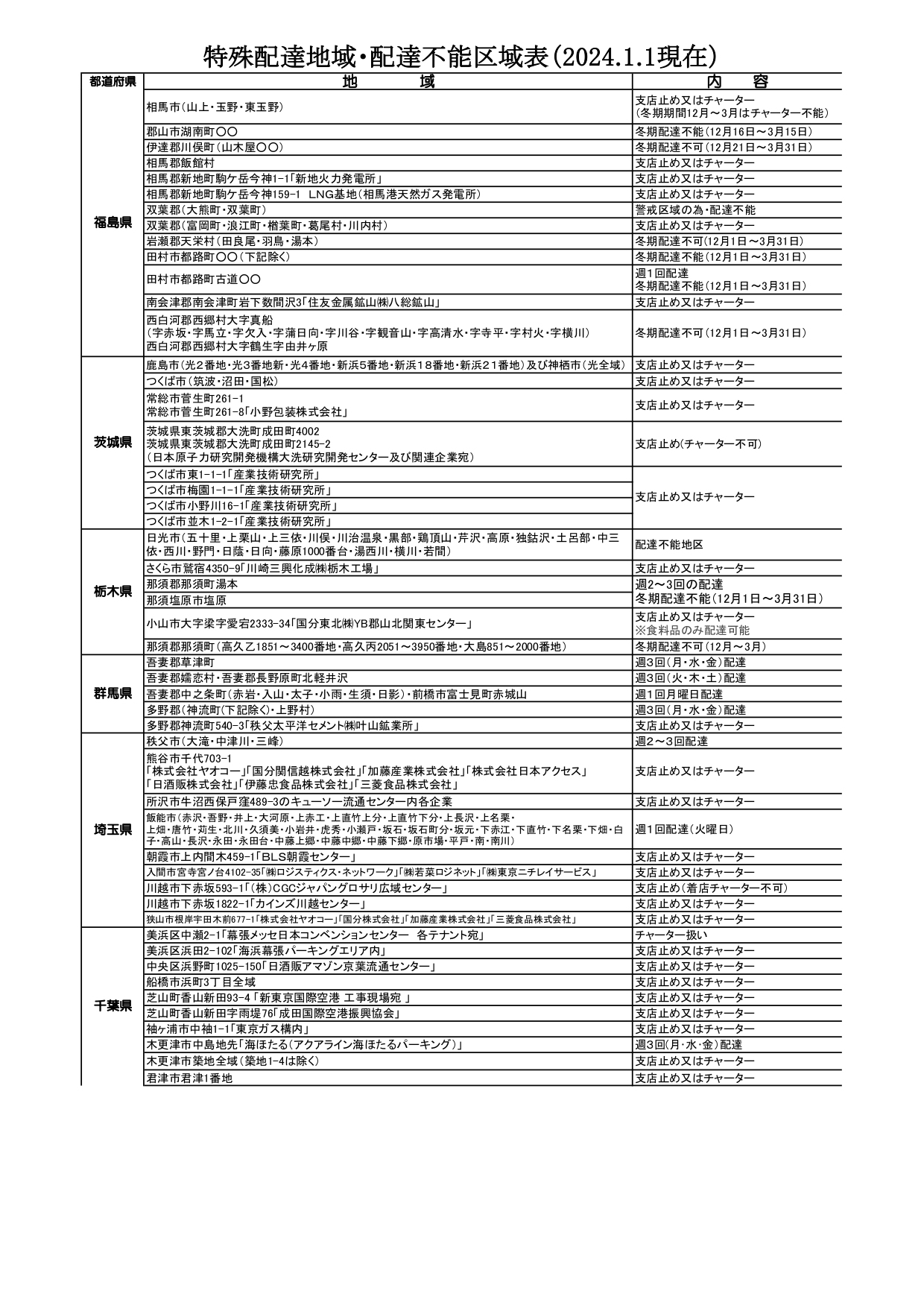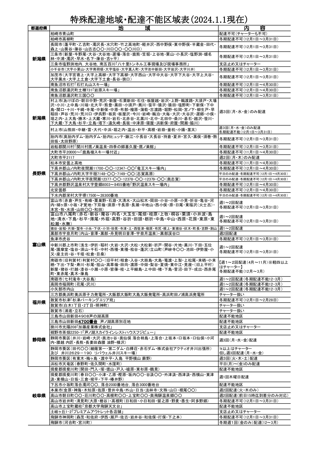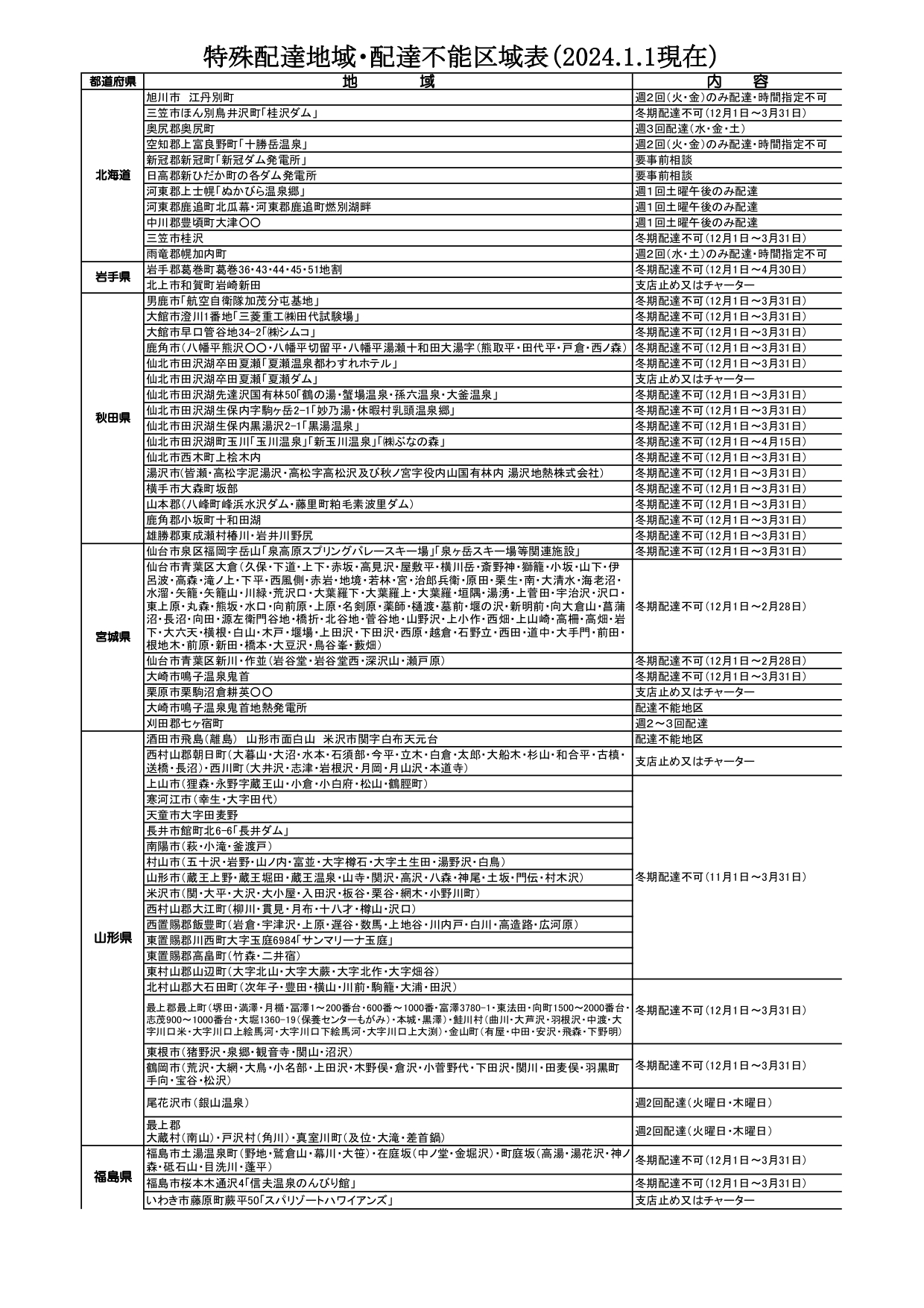 配達不能地域一覧